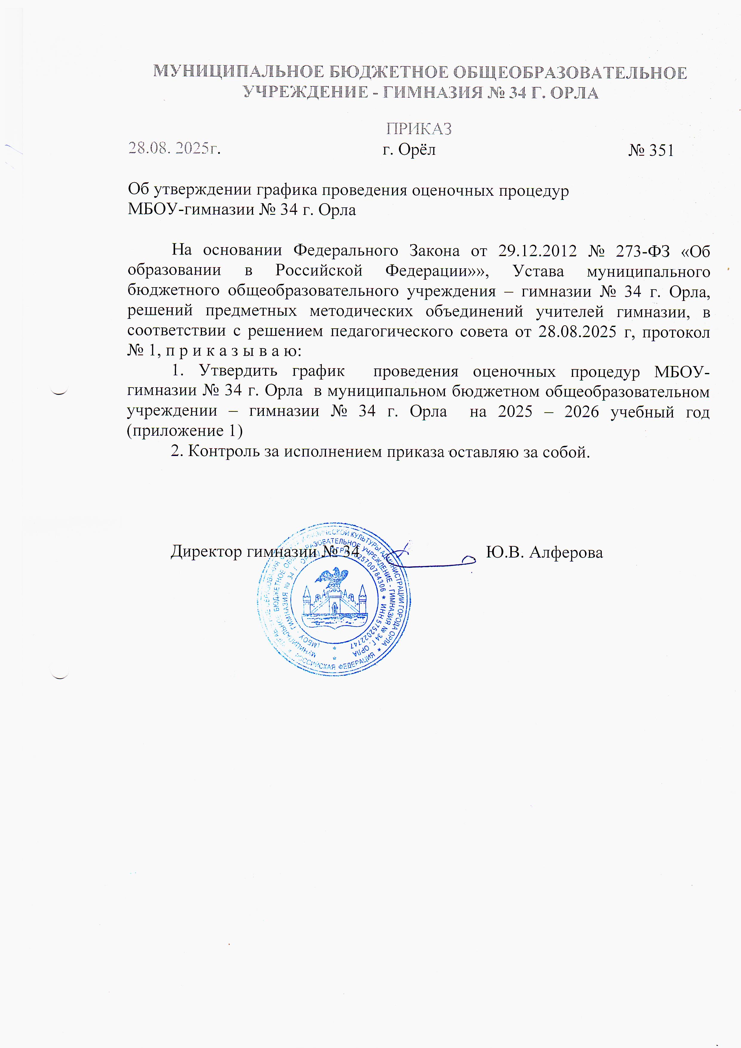 - Устав МБОУ -гимназии №34 г.Орла от 25 октября 2024 г.64459e3d3646cdfe9aad027d39c92a67b9ff914765136f05e245c976c30740625 ноября 2024 г. 12:51 (1730800272)ДиректорАлферова Юлия Владимировна