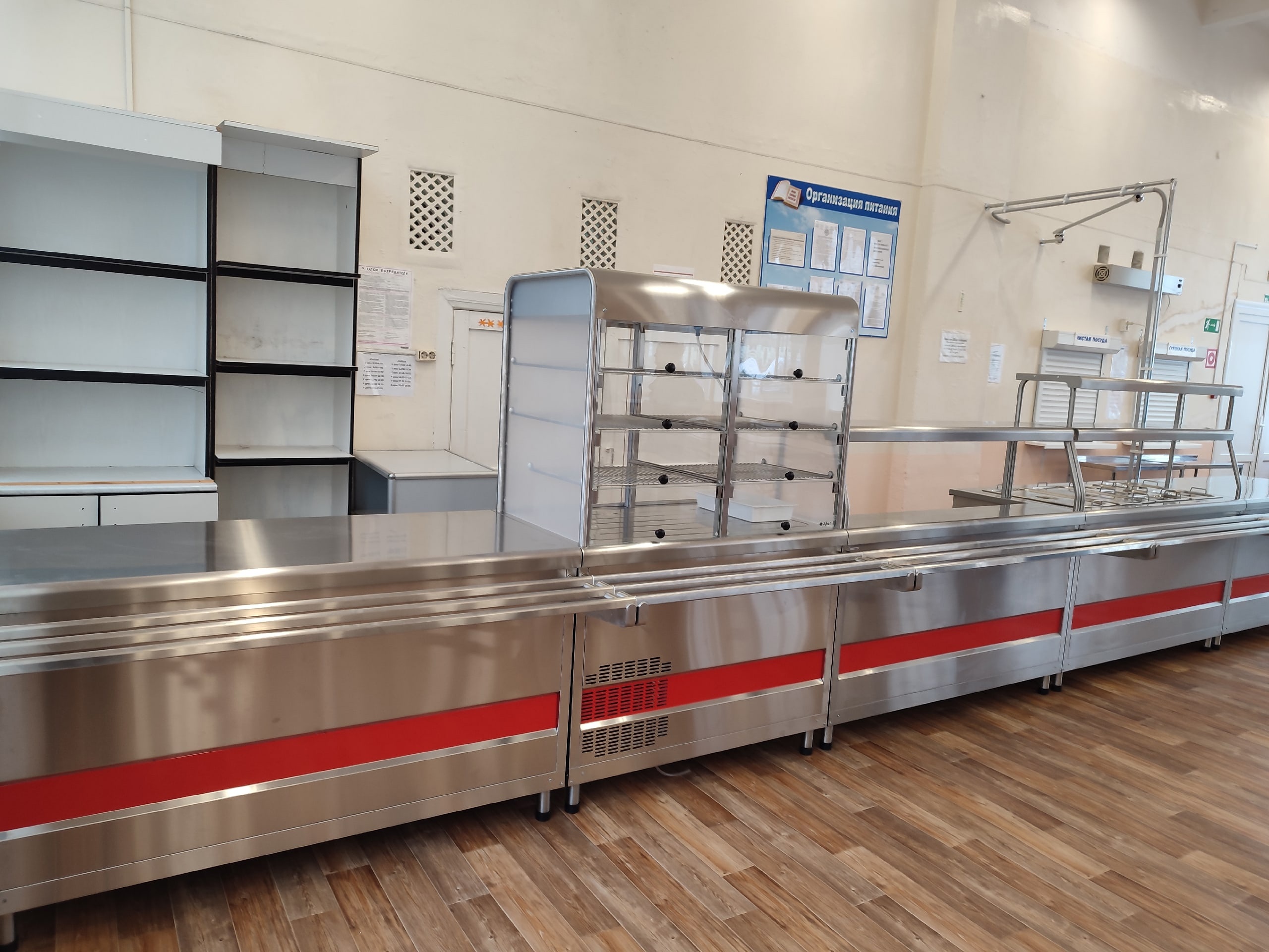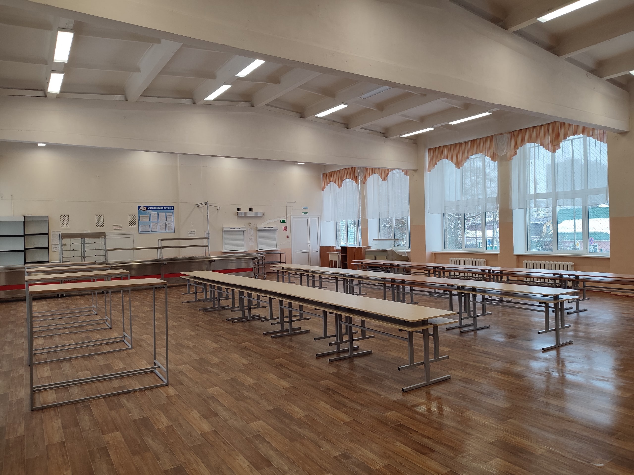 Школьная столовая рассчитана на 198 посадочных мест. Имеются обеденные столы, лавки. Общее количество обеденных столов - 15. В столовой оборудованы линия раздачи с мармитами и буфет.